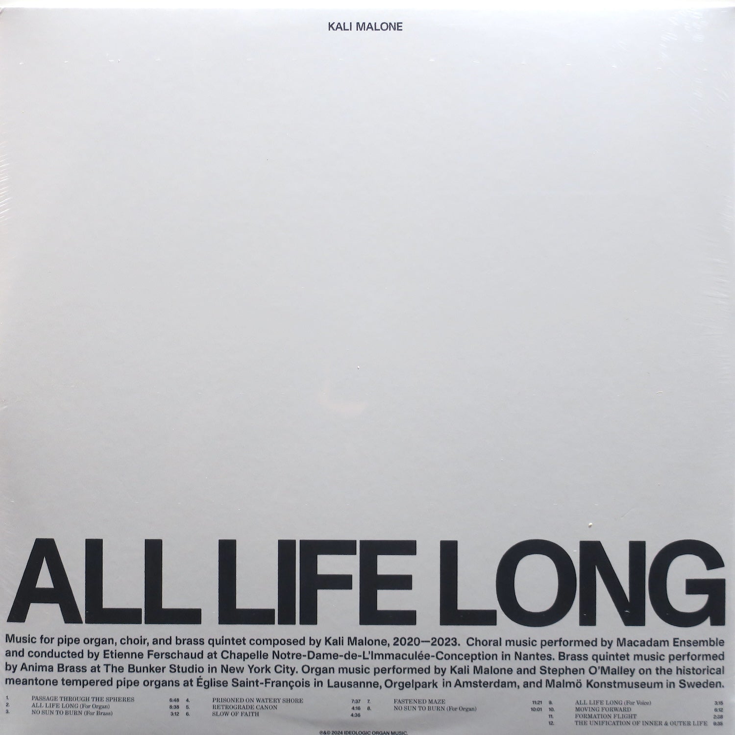 KALI MALONE 'All Life Long' Vinyl LP 2024 Drone/Choral/Classical)